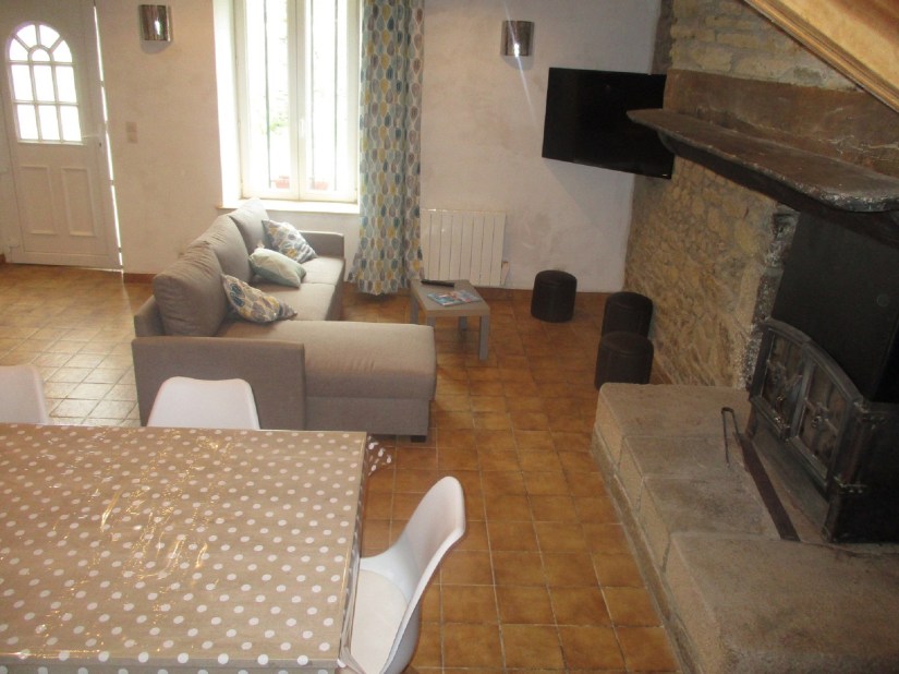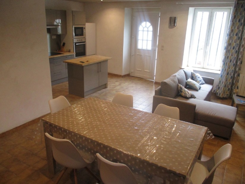 1 pièce à vivre : salle, salon ( avec canapé ) et cuisine (lave vaisselle, micro ondes, frigo avec partie congélateur, four et plaques induction, cafetière…) TV écran plat